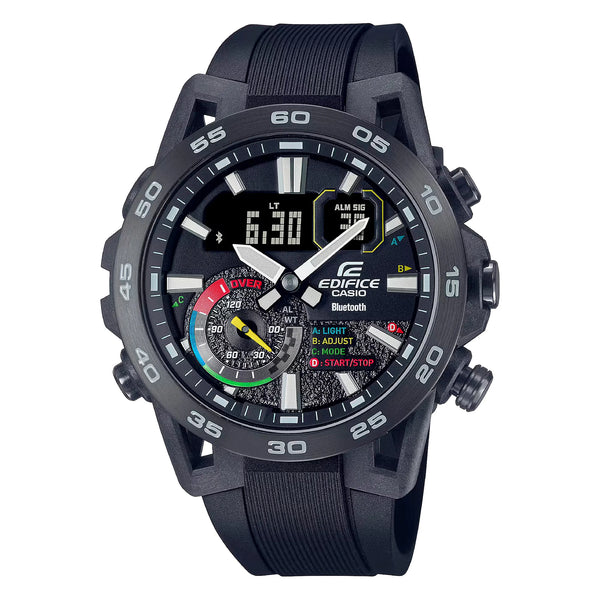 In the realm of timekeeping, where precision meets style, emerges a masterpiece from the CASIO Edifice collection. Crafted for the modern man who values both functionality and flair, this watch is a testament to refined design and innovative technology. Its round case, cloaked in a sleek black hue, commands attention with a commanding 48mm diameter, making it a bold statement on any wrist. The mineral crystal shields the intricate analogue-digital display, a harmonious blend of tradition and modernity. With a water resistance of up to 100 meters, this timepiece is as adventurous as its wearer, ready to accompany you from the boardroom to the beach. The black resin band, secured with a tang buckle, offers both comfort and durability, ensuring it remains a steadfast companion through life's journeys. Inside, the quartz movement, powered by the Caliber 5708, orchestrates a symphony of features: a chronograph for precision timing, an alarm to keep you punctual, a timer for your daily tasks, and world time for the global traveler. The dial, a deep black canvas, is a playground of functionality, featuring a date and month calendar, 24-hour time, and a light for those moments when clarity is needed in the dark. This CASIO Edifice watch is not just a timepiece, it's a celebration of innovation and style, designed for those who dare to blend the classic with the contemporary.