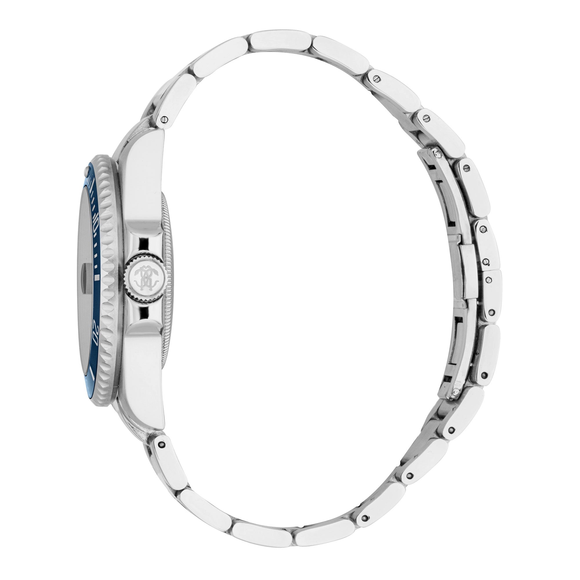 Elevate your style with the Roberto Cavalli Gent RC5G168M0035 men's watch, a masterpiece of modern design and precision. This striking fashion timepiece features a robust 41mm round stainless steel case in a sleek silver grey finish, perfectly complemented by a sophisticated night blue bezel. The vibrant black dial, equipped with luminous hands and indexes, ensures effortless readability in any light, making it a functional yet stylish accessory for the adult male.