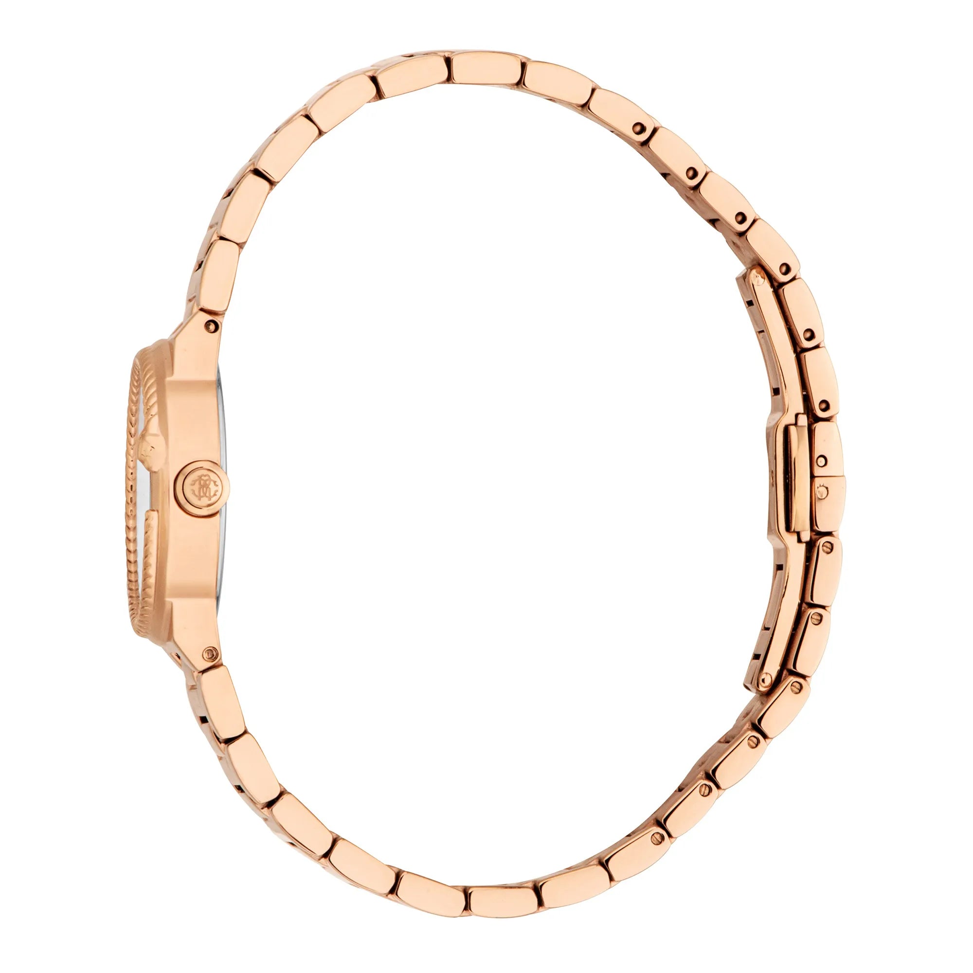 In the world of fashion, where elegance meets innovation, emerges a timepiece that embodies the essence of sophistication and style. Crafted in the heart of Swiss watchmaking, this Roberto Cavalli Lady watch is a testament to refined design and exquisite craftsmanship. Its round case, bathed in the warm glow of rose gold, captures the light with every movement, creating a mesmerizing dance of reflections. With a case diameter of 26mm, it sits gracefully on the wrist, a perfect companion for the modern woman who values both form and function. The silver-grey dial, a canvas of subtlety, is adorned with three hands powered by a precise quartz movement, ensuring that time is always on your side. The mineral crystal offers a clear view of the dial, while the pull & push crown allows for easy adjustments. Encircling the wrist is a stainless steel band, also in rose gold, which complements the case and adds a touch of continuity to the design. The butterfly deployant clasp with a push-button ensures a secure and comfortable fit, making it a seamless addition to any ensemble. With a water resistance of up to 50 meters, this watch is as versatile as it is beautiful, ready to accompany you from the boardroom to a night out. The Roberto Cavalli Lady watch is not just a timepiece, it is a statement of elegance, a reflection of the wearer’s impeccable taste and a celebration of timeless fashion.