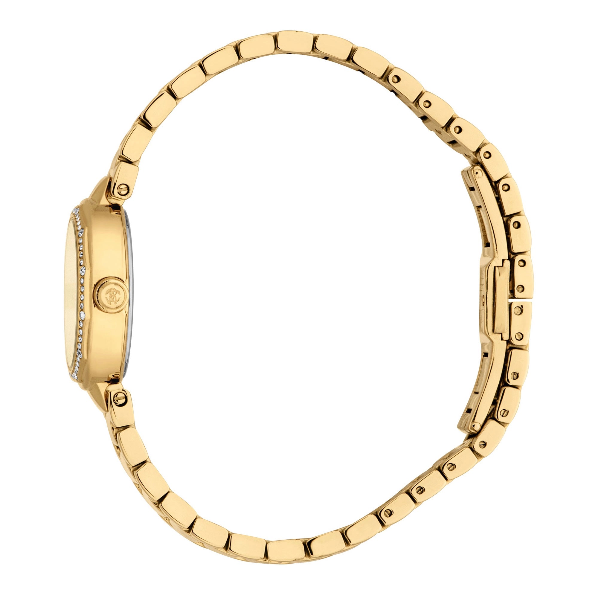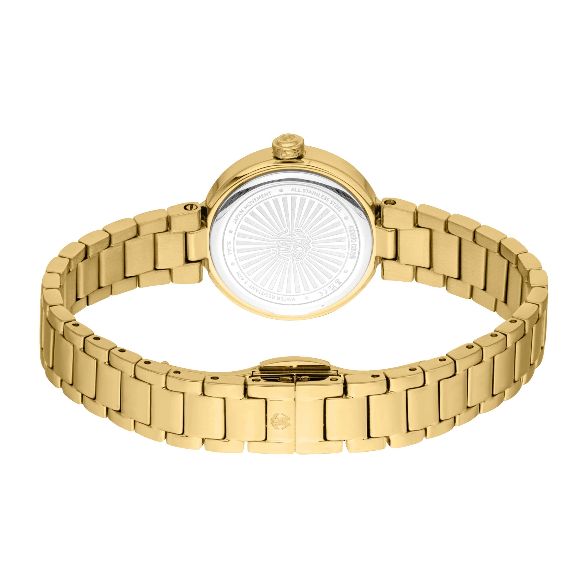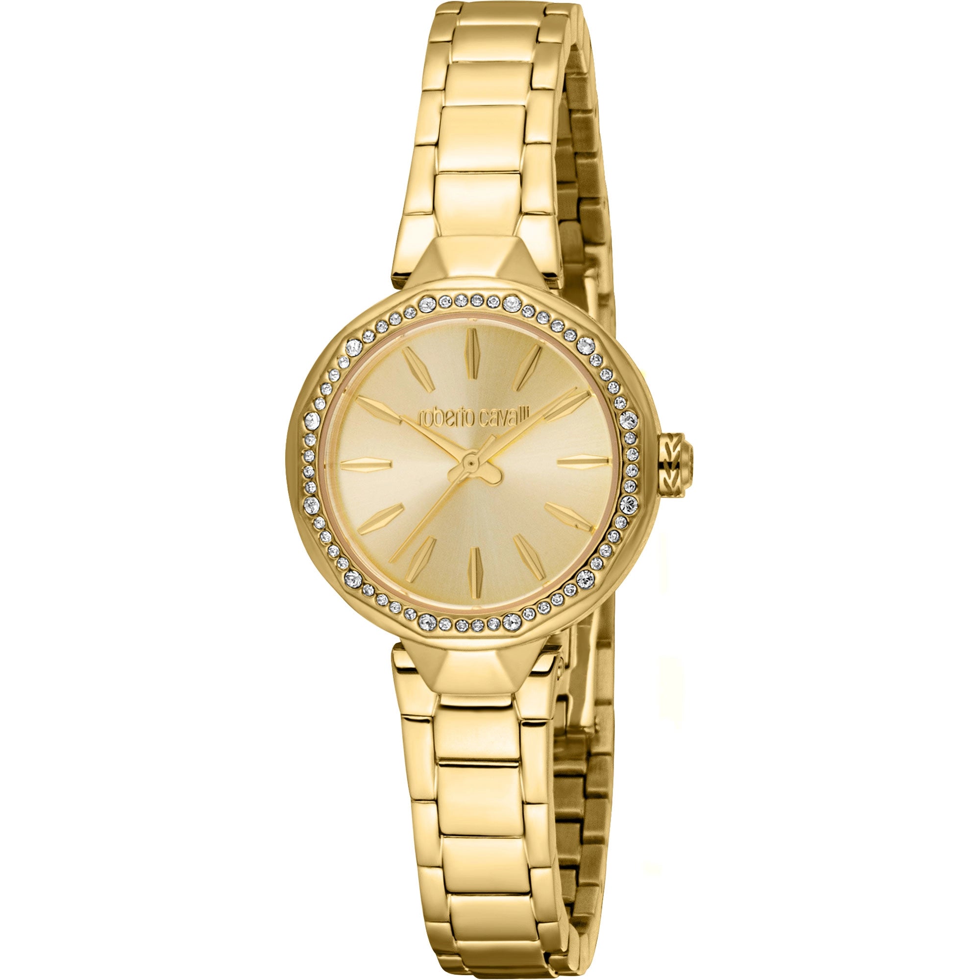 This elegant Roberto Cavalli women's watch features a radiant yellow gold IP-plated stainless steel case, measuring a delicate 26mm in diameter and 8mm thick. The round case is meticulously adorned with 61 sparkling zircons around the bezel, adding a dazzling touch of glamour. A durable mineral crystal protects the captivating champagne dial, which showcases a classic 3-hand display, all powered by a reliable CITIZEN GL32 Quartz movement.