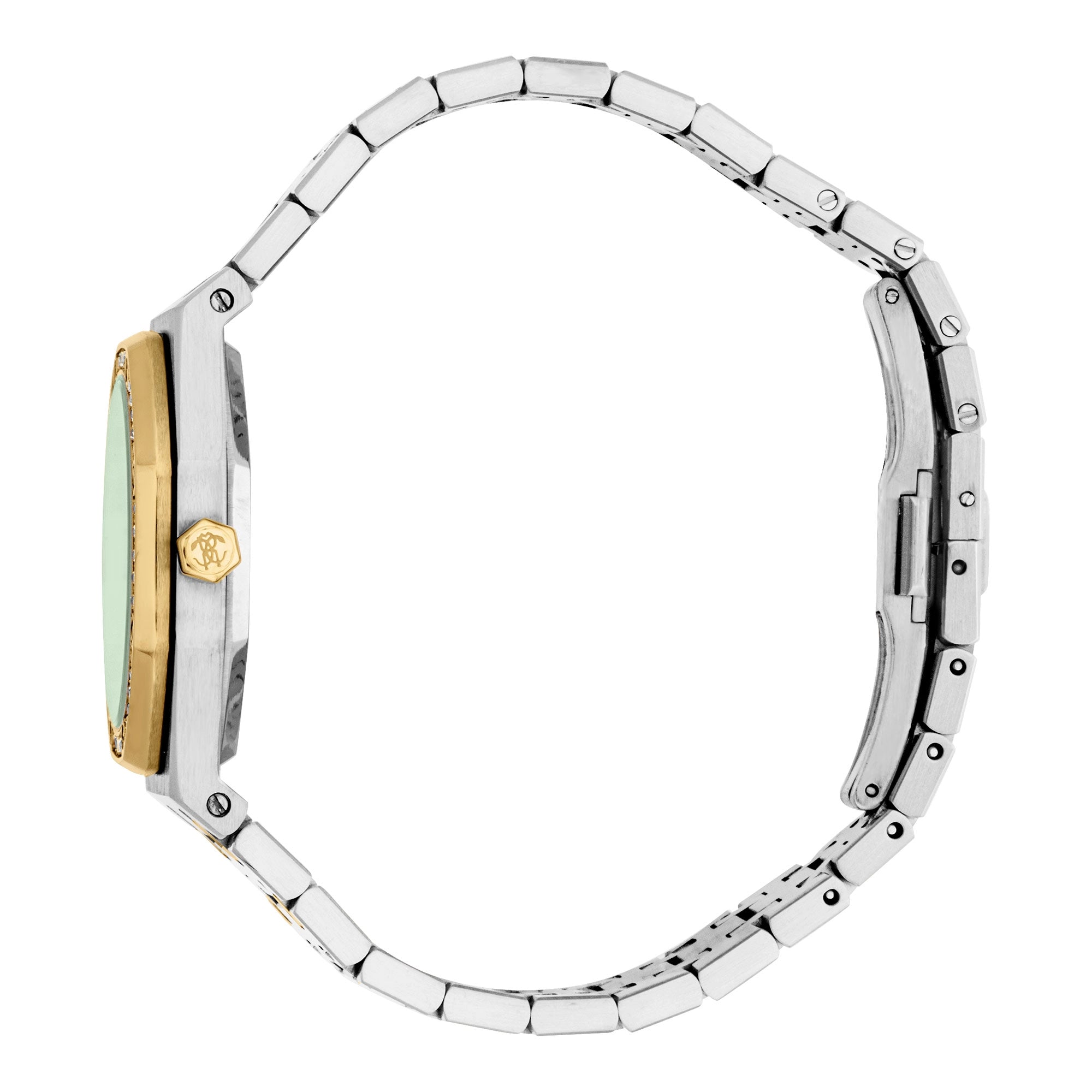 Elevate your style with the exquisite Roberto Cavalli Lady RC5L159M0085, a sophisticated fashion watch crafted for the modern woman. This stunning timepiece showcases a luxurious two-tone design, featuring an IP plated stainless steel case and matching band that beautifully combine silver-grey and radiant yellow gold. The elegant 34mm round case, with a slim 9mm profile, is meticulously adorned with 40 brilliant zircons, adding an undeniable sparkle.