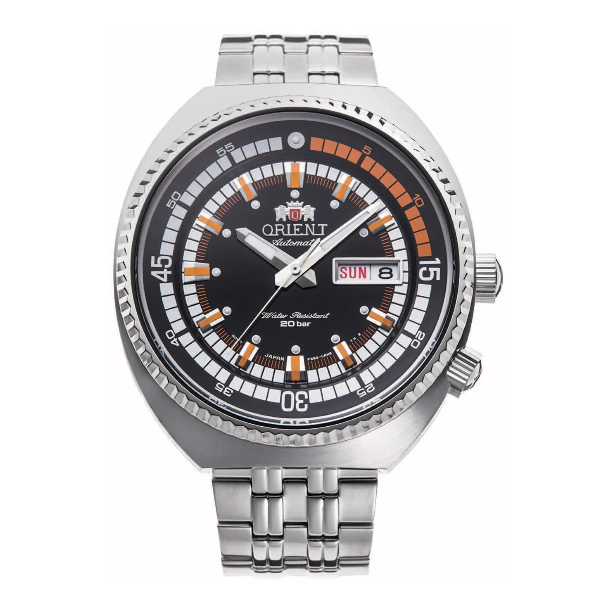 In the realm of timepieces, where precision meets elegance, emerges a creation that embodies the spirit of adventure and sophistication. Crafted in the heart of horological excellence, the ORIENT AA0E Neo Classic Sports watch is a testament to the art of watchmaking. Its round case, bathed in a sleek silver grey hue, commands attention with a diameter of 43mm, offering a perfect balance between boldness and subtlety. Designed for the modern man who embraces both style and functionality, this watch is a companion for life's diverse journeys. The stainless steel band, mirroring the case's silver grey elegance, wraps around the wrist with a sense of timeless grace, secured by a folding deployant clasp with a push-button for ease and security. Beneath the mineral crystal, the black dial serves as a canvas of sophistication, where the dance of three hands is orchestrated by the mechanical movement of caliber F6922, boasting 22 jewels. This masterpiece not only tells time but narrates the day and date, ensuring you are always in sync with the world. With a water resistance of Diver's 200 meters, it invites you to explore the depths, while the pull & push crown offers seamless adjustments. The ORIENT AA0E Neo Classic Sports watch is more than an accessory, it is a statement of refined design and mechanical prowess, a tribute to those who appreciate the fusion of tradition and innovation.