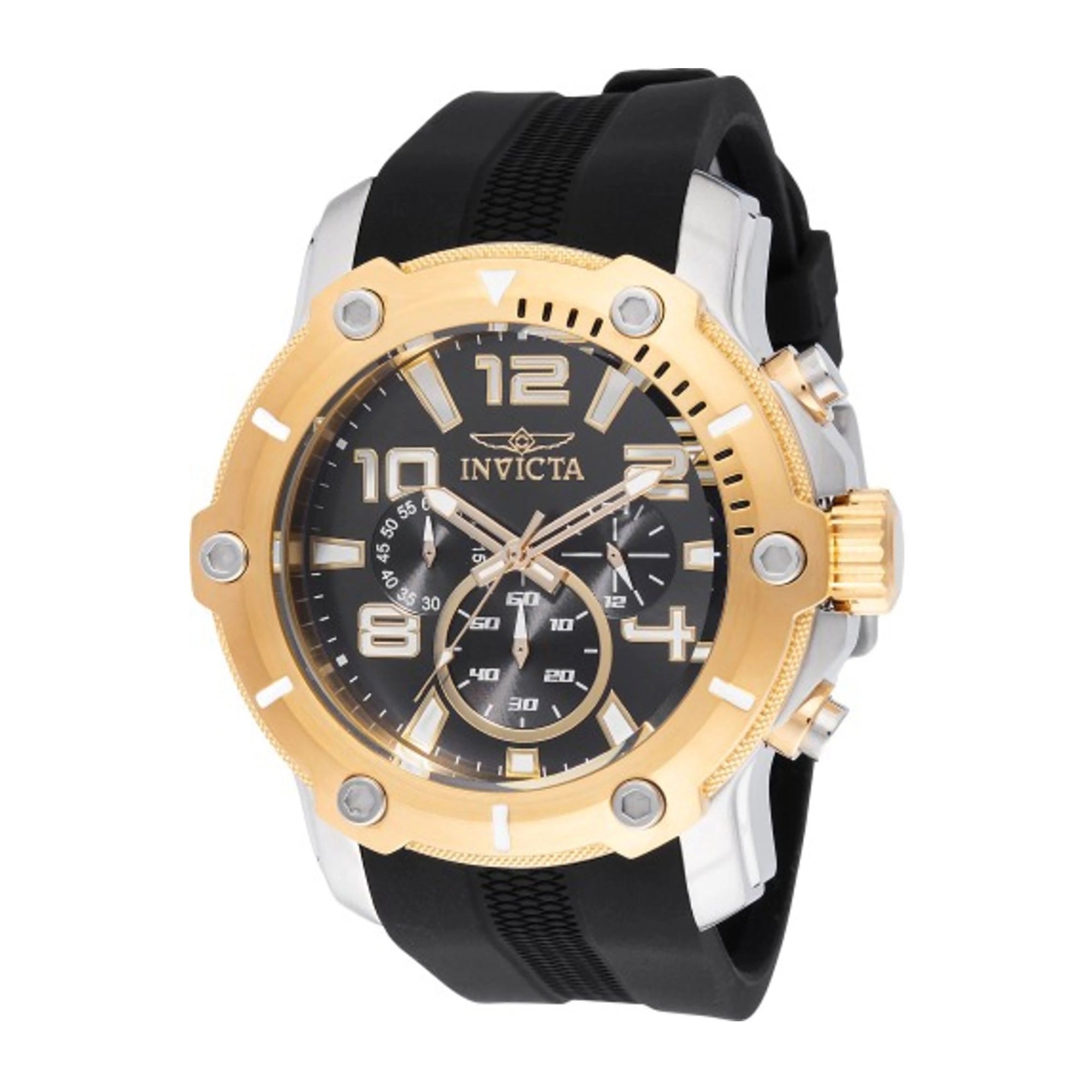 Discover the Invicta Pro Diver, a bold and reliable men's watch crafted for the modern adventurer. This 49mm timepiece boasts a robust silver-grey stainless steel case with striking yellow gold accents on its bezel, perfectly paired with a comfortable 26mm black silicon band featuring a secure tang buckle closure.