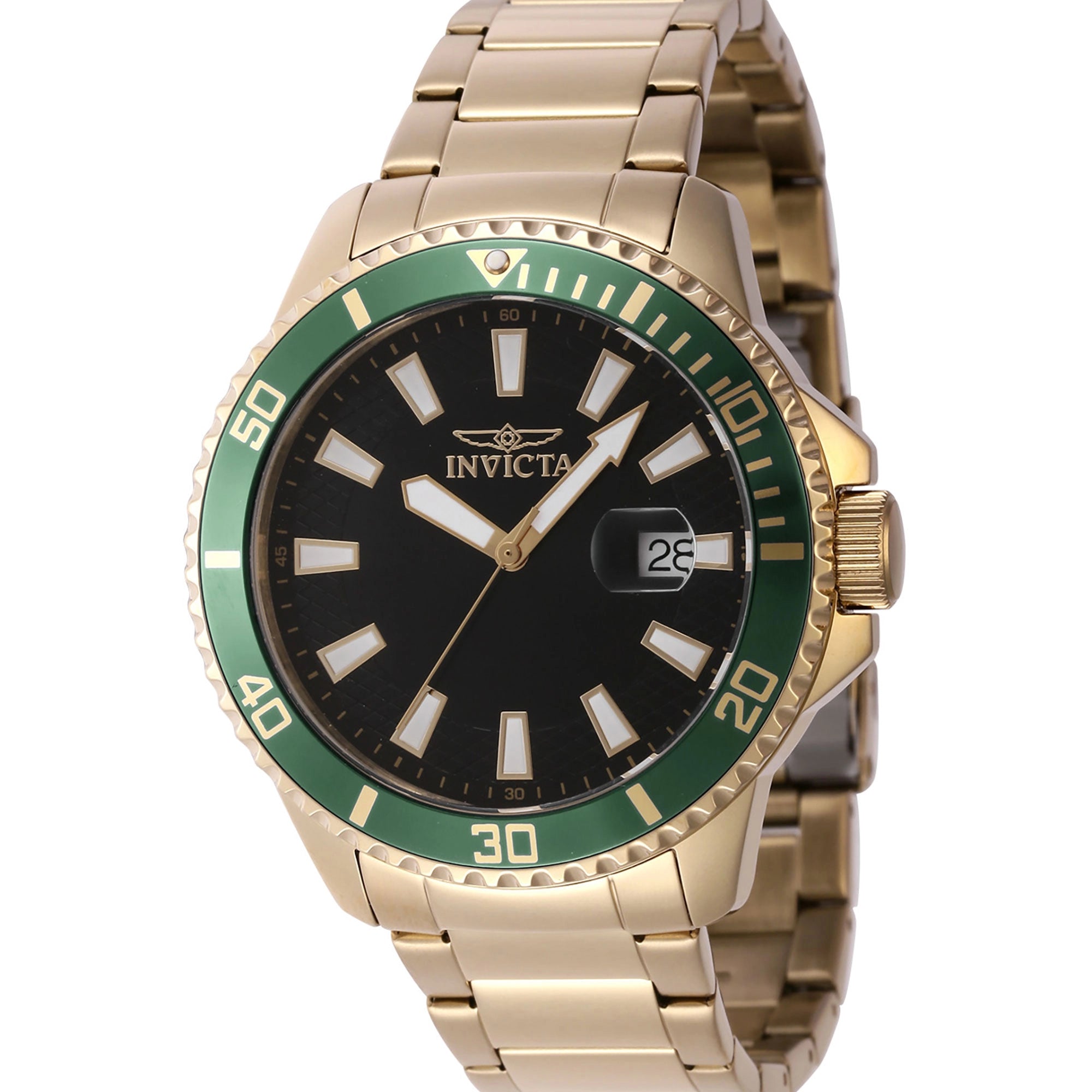 The 45mm round stainless steel case shines in a striking yellow gold finish, beautifully complemented by a vibrant green aluminum bezel. Its bold aesthetic is matched by a sleek black brass dial featuring luminous hands for easy readability in any light. Powering this exceptional Invicta watch is a dependable SEIKO VJ42 Quartz movement, offering precise three-hand timekeeping and a convenient date display. The durable Hardlex crystal protects the dial, ensuring long-lasting clarity.