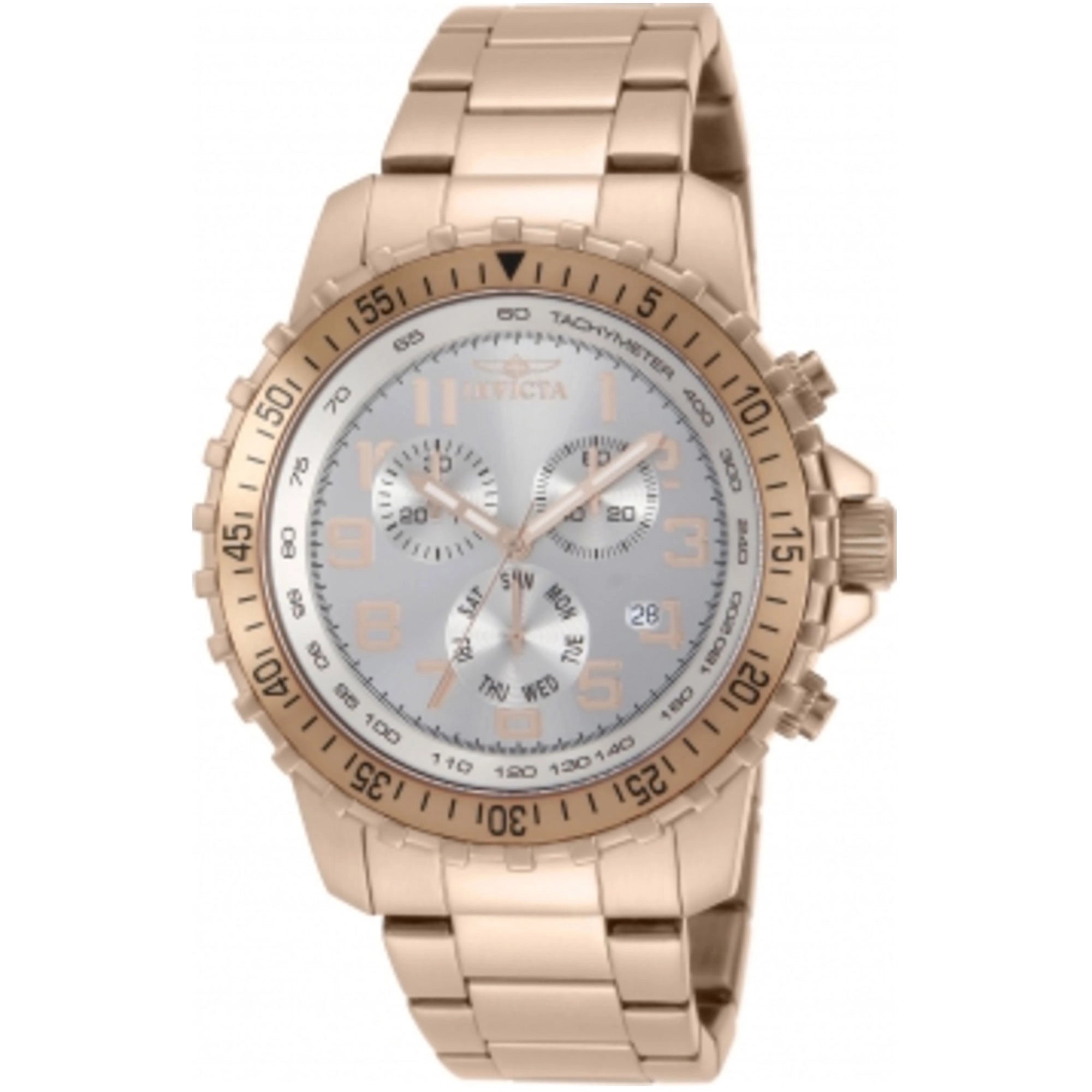 Experience ultimate comfort and a seamless aesthetic with the 22mm wide rose gold stainless steel band, secured by a reliable butterfly deployant clasp with a convenient push-button. With 100 meters (WR 100mt) of water resistance, this Invicta watch is ready for your daily adventures, from casual wear to a refreshing swim.