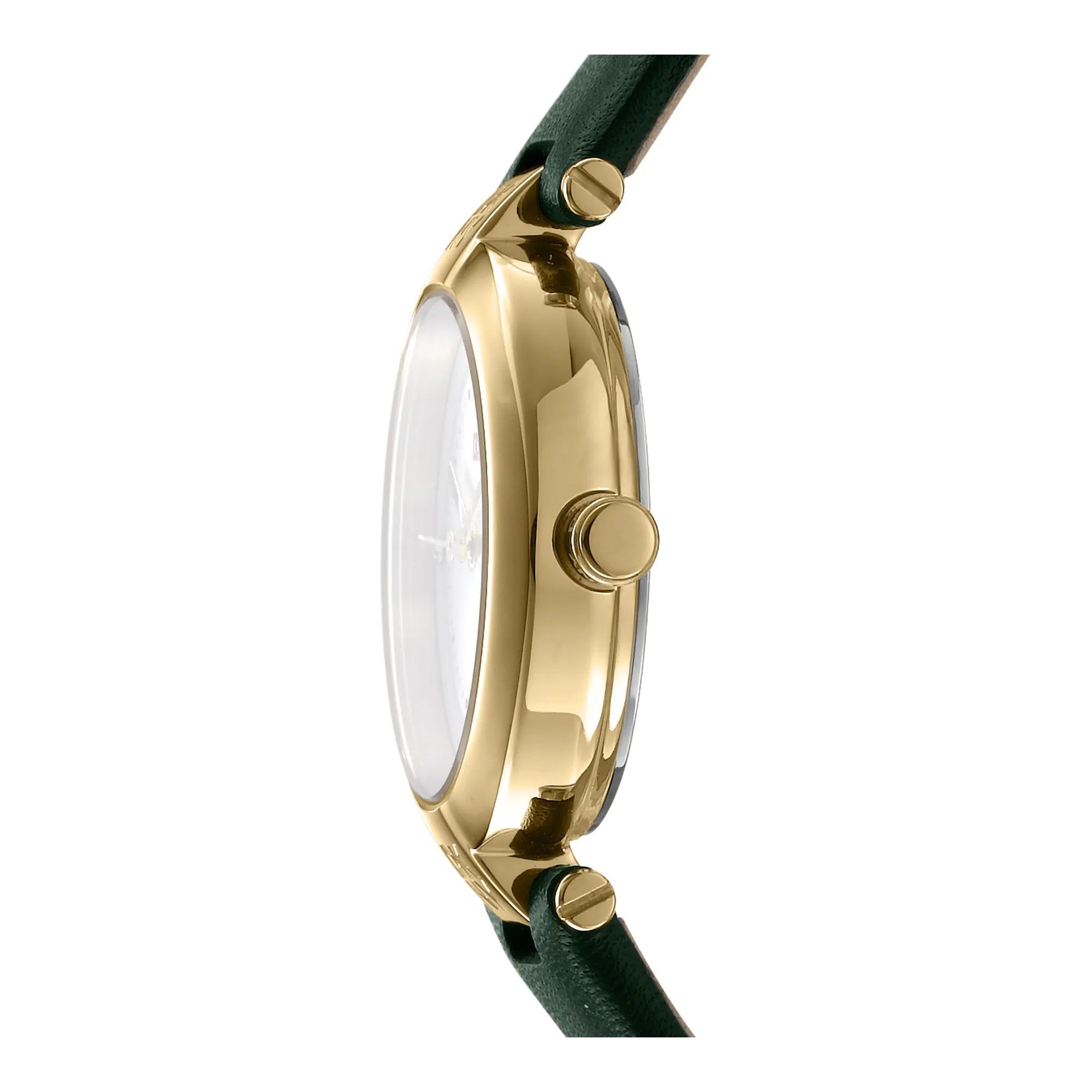 No vibrante coração da cidade de Nova Iorque, onde a moda encontra a funcionalidade, surge um relógio que personifica a essência da elegância urbana. O relógio DKNY Essential Mini é um testemunho de design refinado, concebido para a mulher moderna que valoriza tanto o estilo como a substância. A sua caixa redonda, banhada num luxuoso tom de ouro amarelo, capta a luz a cada movimento, criando uma dança cativante de reflexos. Com um diâmetro modesto de 28 mm, este relógio é o companheiro perfeito para quem prefere a subtileza sem sacrificar a sofisticação. O mostrador cinza-prateado, adornado com três ponteiros, oferece um contraste minimalista mas marcante contra a vibrante correia de couro verde garrafa. Este toque de cor adiciona um elemento divertido, tornando-o um acessório versátil para qualquer conjunto. O fecho de fivela assegura um ajuste seguro, enquanto o cristal mineral proporciona uma visão clara das horas, protegido contra os rigores do dia a dia. Com resistência à água até 50 metros, este relógio é tão prático quanto elegante, pronto para acompanhar desde o escritório até uma saída à noite. Movido por um movimento de quartzo preciso, o DKNY Essential Mini não é apenas um relógio, é uma declaração de pensamento vanguardista e elegância intemporal.