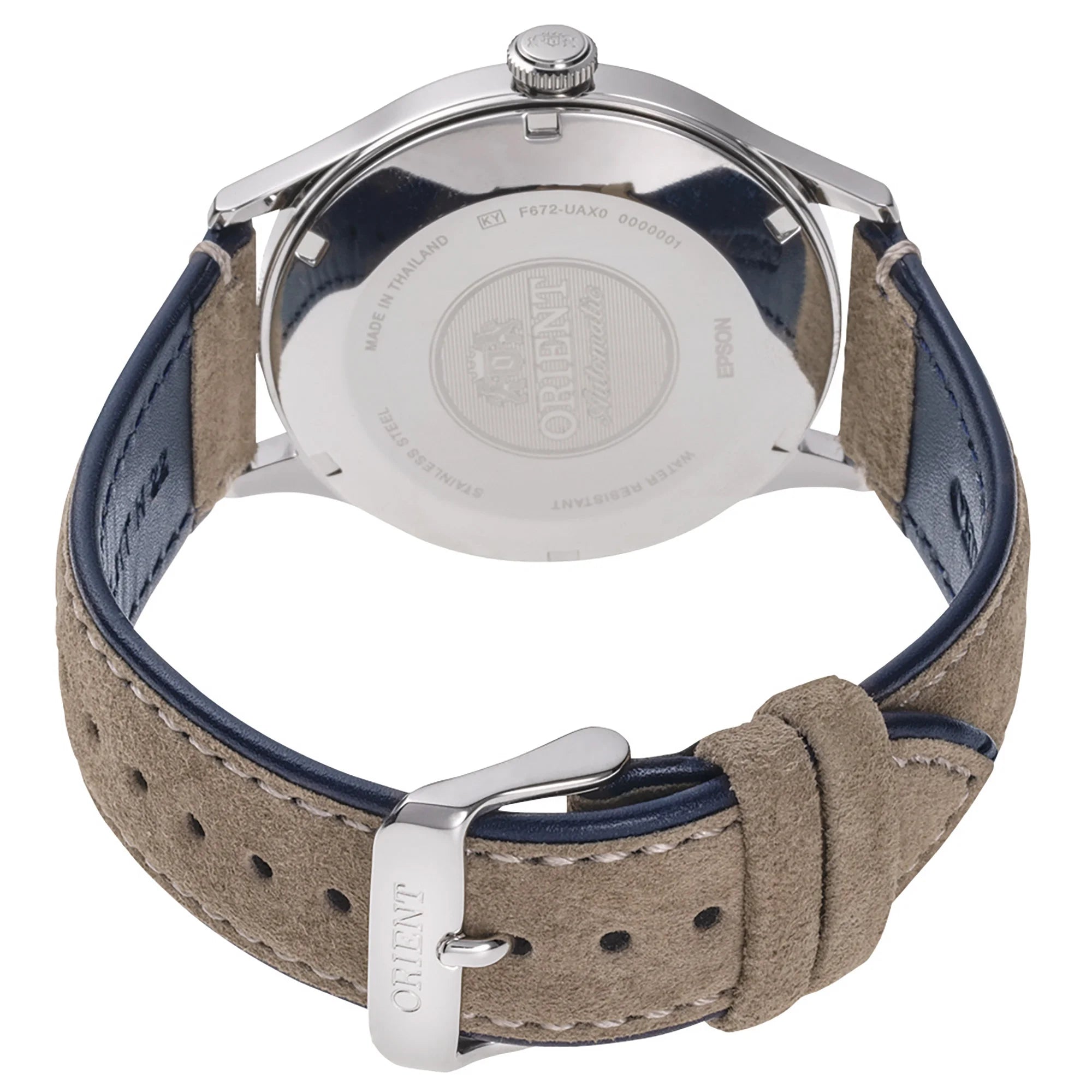 In the realm of timeless elegance, the ORIENT AC0P Bambino V4 emerges as a beacon of sophistication and style. Crafted with precision, this ORIENT Classic watch is a testament to the art of watchmaking, designed for the modern man who appreciates the finer things in life. Its round case, bathed in a sleek silver grey hue, measures a commanding 42mm in diameter, exuding a refined presence on the wrist. The mineral crystal protects a mesmerizing night blue dial, reminiscent of a starlit sky, where three hands gracefully sweep across its surface, marking the passage of time with effortless grace. The beige leather band, secured with a tang buckle, adds a touch of casual elegance, making it the perfect companion for any occasion. Beneath its exquisite exterior lies the heart of the watch—a mechanical movement powered by the F6724 caliber, boasting 22 jewels and offering both hand-wound and automatic capabilities. With a daily accuracy of +25/-15, this timepiece ensures precision in every moment. The date calendar feature adds practicality to its allure, while the pull & push crown allows for easy adjustments. Water-resistant, this watch is ready to accompany you through life's adventures, whether you're navigating the urban jungle or enjoying a leisurely day by the water. The ORIENT AC0P Bambino V4 is not just a watch, it's a statement of refined taste and timeless style, a true companion for the discerning gentleman who values both form and function in his everyday life.